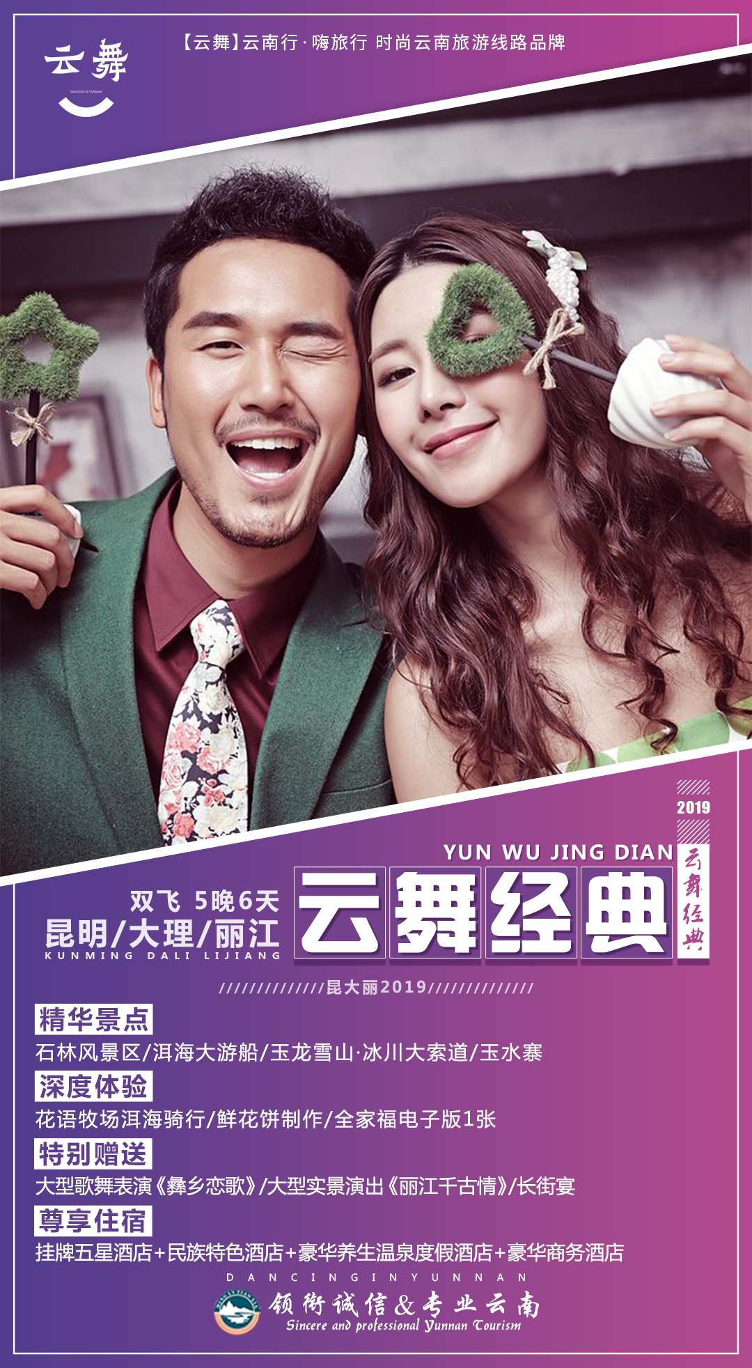 产品特色吃●全程当地特色餐,满足舌尖味蕾,品尝民族风味住●全程指定特色酒店标准,住的舒服才能玩的开心,特别安排石门关山谷温泉酒店行●旅游大巴干净卫生,专业导游贴身陪同游●精华景点,名胜古迹,特别安排洱海吉普车花海S湾旅拍不虚此行特别安排:刘亦菲主演火热连续剧《去有风的地方》取景地沙溪古镇娱●飞拉达攀岩体验,互动游戏彝族篝火晚会,泡露天温泉,大型实景演出《印象丽江》快乐游云南 简易行程预览:D1:起始地自行乘机或高铁→昆明接机或接站D2:彝人古镇→石门关景区D3:大理古城→私人游艇→洱海边吉普车花海S湾美拍→沙溪古镇D4:鹤庆小镇→玉龙雪山→印象丽江→蓝月谷→丽江古城D5:束河古镇→拉市海→昆明D6:旅游集散中心→昆明长水国际机场→返程起始地