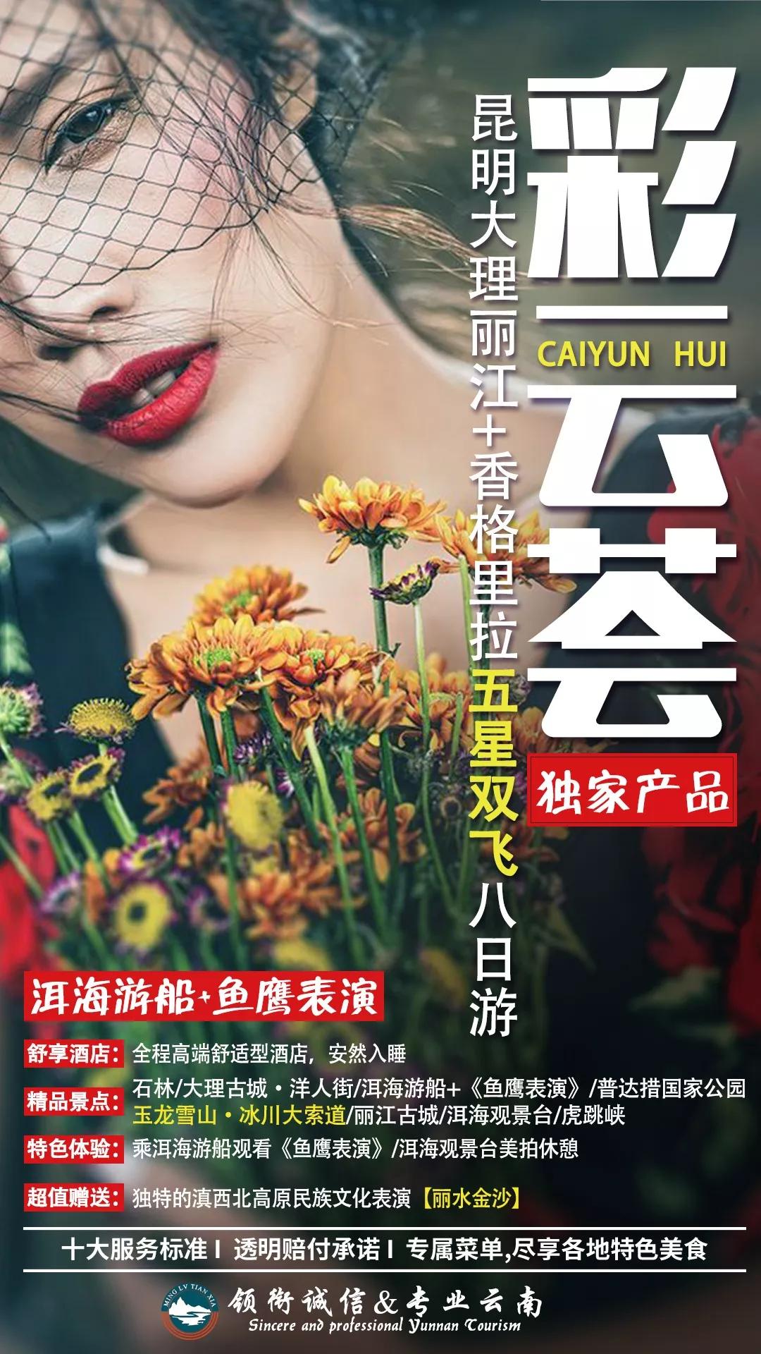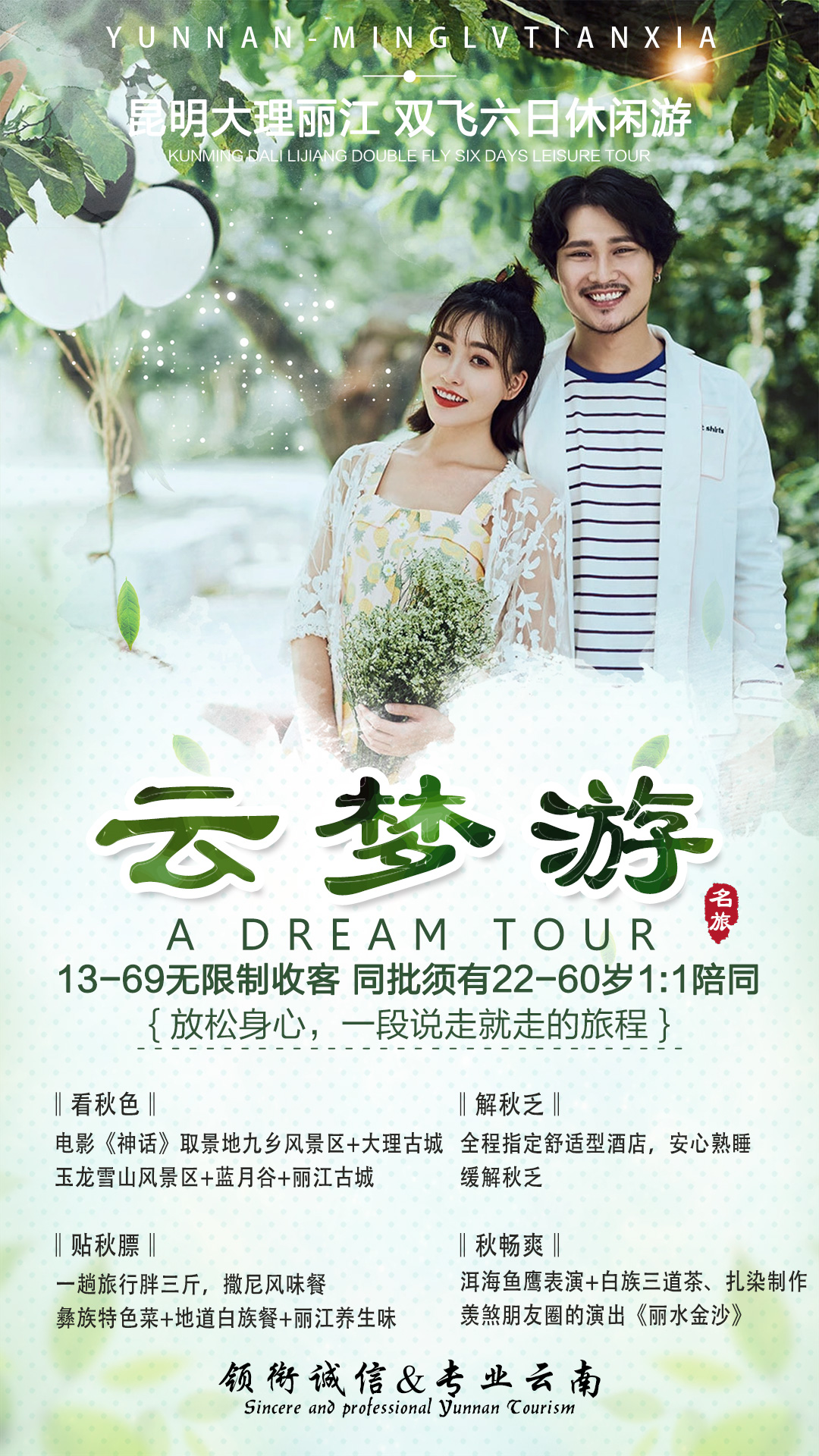 ▲“彩云荟 ”专属菜品云南美食,拥有一种藏在山水间的原味,就地取材,却不同食法。料广,色美,型巧,味全,看者胃开,闻者流涎,食者回味……你的味蕾,将从这里开始体验一场真实的美味之旅。▲“彩云荟 ” 十项服务标准+透明赔付承诺膳食——正规餐厅,定点用餐,菜单明示,确保品质 住宿——指定酒店,干净卫生,安全舒适,临变升级车辆——正规营运,四年之内,干净舒适,安全保障 接送——规范接机,随到随走,便捷送机,贴心送机司机——正规资质,着装整洁,持证上岗,安全驾驶 导游——正规资质,着装整洁,佩证上岗,规范服务景点——景点固定,不增不减,精华景区,时间充裕 购物——土特商品,货真价实,自由选购,自主消费自费——项目明确,价格透明,自愿原则,自主消费 质量——专人专线,即时处理,质量问题,限时反馈以上服务一旦出现问题,客人对我社处理结果不满意,现场赔付1000元/人/项。▲“彩云荟 ”安心出行设计● 全程空调旅游大巴,一人一正座。知识渊博、幽默的导游将带你一同游行趣味云南,为您提供专业导游服务的同时贴心为您解决旅程所遇一切问题;驾龄丰富的司机将为此趟精彩行程保驾护航,让您乘坐安心。● 我们为每一位游客购买云南旅游组合保险,多重安全保障,让您出行无忧。