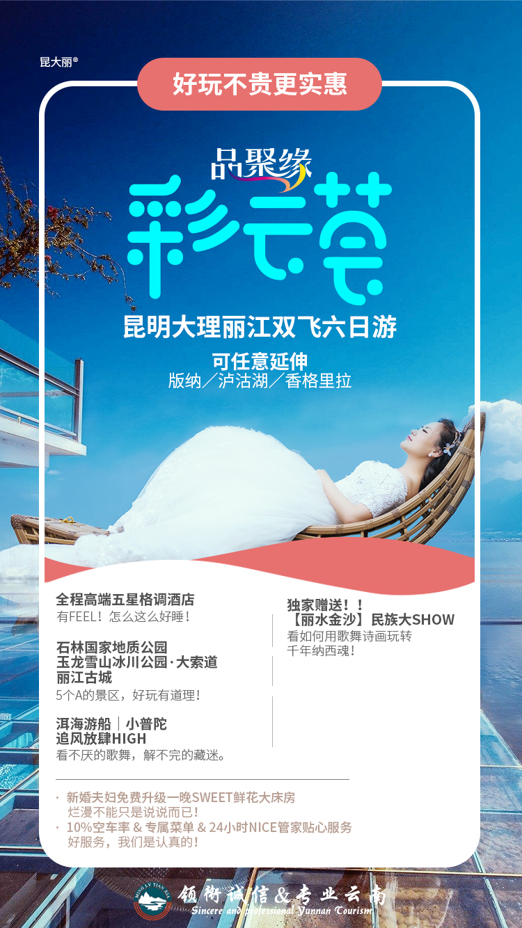 ♥ 最 • 便利环飞出游,一路向前,不走回头路省24小时约2000公里的时间留给风景我们的旅行从不在路上浪费生命♥ 最 • 味觉CCTV舌尖上的云南精选美味,让你的味蕾得到释放云南有着“一山分四季,十里不同天”的美景,也有着“一天吃四季,十餐不同味”的美食。众多的少数民族、得天独厚的气候及自然资源造就了云南千百年来独树一帜的美食文化。生活在这片土地上的各民族人民又以自己的想象力和智慧挥洒着关于美食的浪漫。对于吃货来说,美食或许远比美景诱人,你还在等什么,还不快快开启你的美食之旅。♥ 最 • 陶冶赠投资2.5亿元大型民族生态演出《印象丽江》是张艺谋导演的实景演出。当演出开始时,悠扬的音乐旋律,热血沸腾的鼓乐声,简简单单的舞步,原声朴实的歌声,尽情挥洒的汗水,在玉龙雪山为背景的衬托下,一场场荡涤灵魂的盛宴,给人绝对的震撼。♥ 最 • 安适最美云南自然什么都应该是最美的,住宿当然也不例外全程指定五星酒店,让您玩的开心,住的舒心,吃的畅心如遇特殊情况我们将给您安排入住同级酒店,让您感受同样的舒适