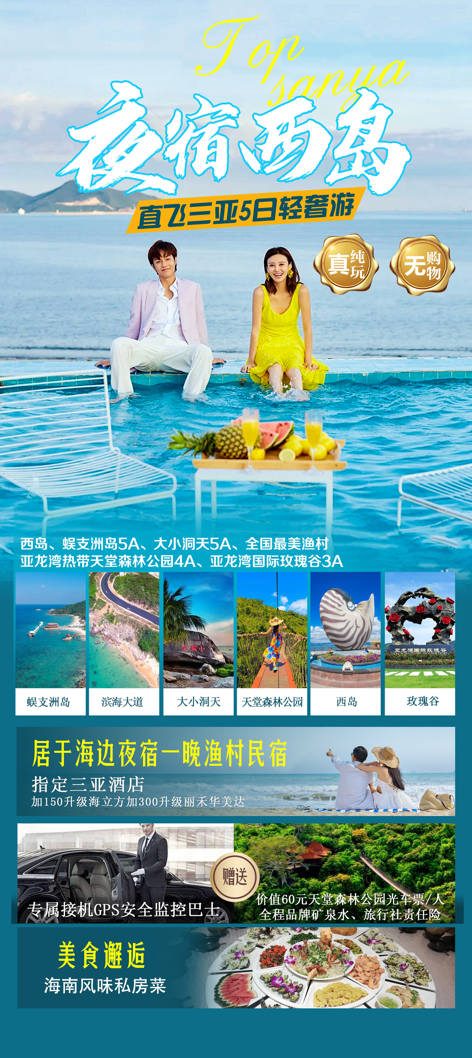 行程特色:一次文艺清新的归心之旅;览清新海岛风景,品渔村古朴风情;玩转世界稀岛—西岛,探访400年全国最美渔村,感受无忧无虑的渔民生活;夜宿渔村民宿,依偎大海|枕浪眠风,不一样的海岛生活体验特色住宿:夜宿一晚渔村民宿,搭配三亚酒店(三个酒店套餐可选:碧海金沙酒店-园景房、海立方酒店-豪华海景房、丽禾华美达广场酒店-海景房) 西岛民宿第4天入住 ,此房型不可加床优选景区:西岛、蜈支洲岛5A、亚龙湾热带天堂森林公园4A、大小洞天5A、亚龙湾国际玫瑰谷3A美食味蕾:社会小炒 贴心赠送:价值60元天堂森林公园光车票/人、全程品牌矿泉水、旅行社责任险(保额20万元/人)品质保障:专属接机(免拼车、等待),精选专业优秀导游、耐心解说、贴心服务,海南地接指定高一级GPS安全监控系统空调旅游巴士;接待承诺:①不更换景点、不减少景点、无强迫费、保证游览时间; ②绝不增加行程外购物店。