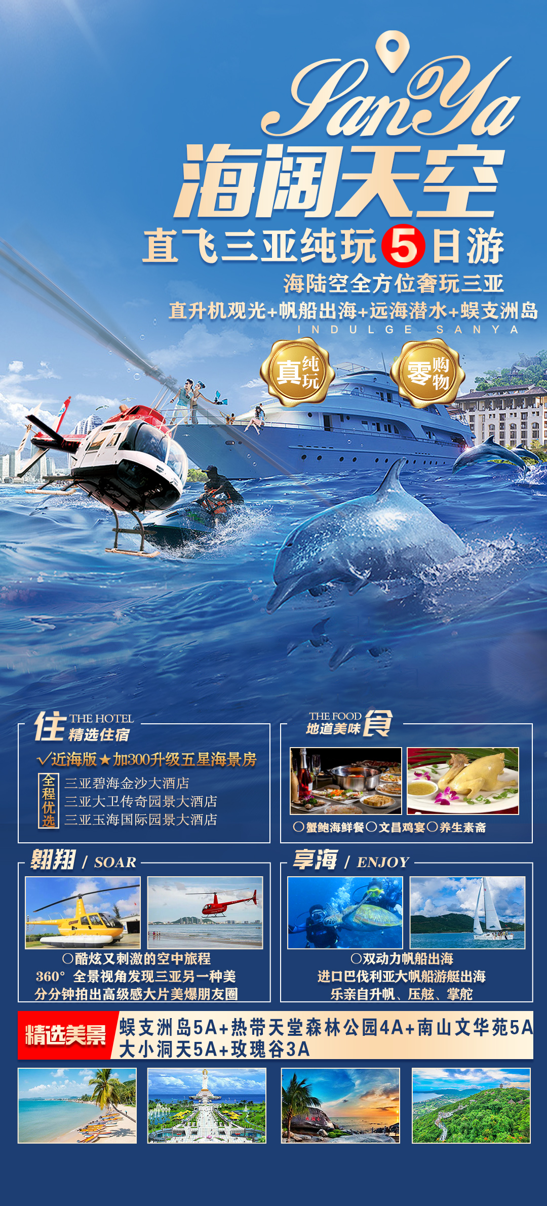 行程特色:全程零购物纯玩专享;海陆空全方位,上天入海,奢玩三亚!直升机观光+帆船出海+远海潜水+蜈支洲岛等海南热门景区,海南正宗特色餐舌尖过足瘾,元气满满畅快撒欢!精选酒店:全程入住三亚海边酒店。 精选景区:蜈支洲岛5A、南山文化苑5A、大小洞天5A、热带天堂森林公园4A、玫瑰谷、 三亚海旅免税城 赠海陆空项目(直升机观光+帆船出海+远海潜水)美味餐食:品尝本土特色美食,蟹鲍海鲜餐、文昌鸡宴、养生素斋。贴心赠送:全程品牌矿泉水、旅行社责任险(保额20万元/人)。品质保障:精选专业优秀导游、耐心解说、贴心细致服务;单接无拼车;海南地接指定高一级GPS安全监控系统空调旅游巴士。接待承诺: ①不增加行程外购物店(景购和免税店不属于购物店范畴); ②不更换景点、不压缩游览时间。