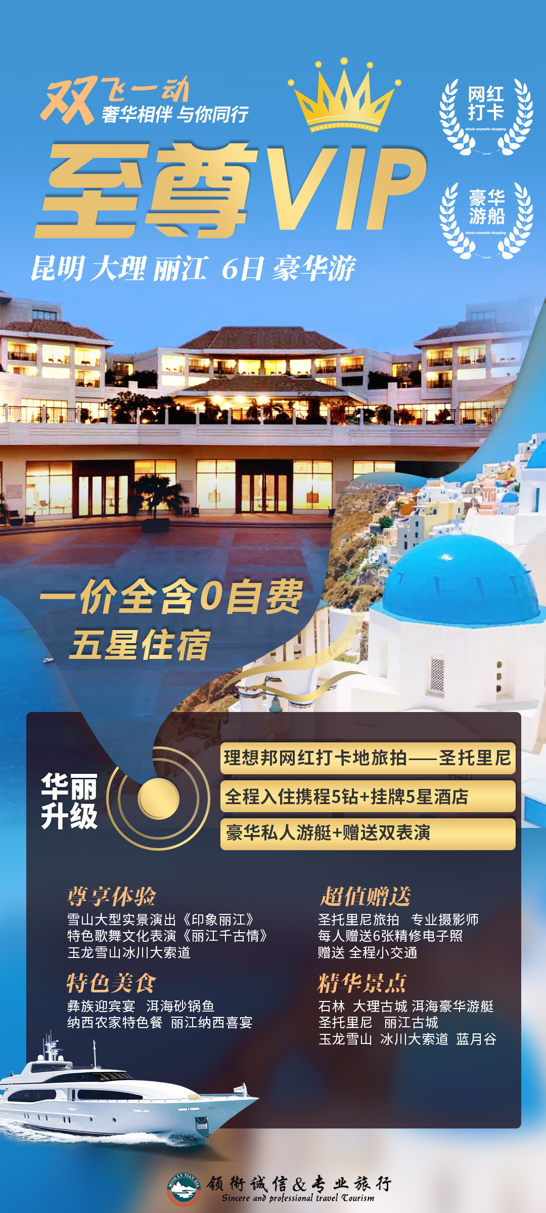 奢享五星酒店,全程入住携程5钻+挂牌5星酒店,奢华与舒适并存,享受轻奢高品质度假体验为了能有一段开心的旅程,住的舒适,我们严选酒店安排全程入住携程5钻+挂牌5星酒店。享受高端奢华的酒店服务,给您沁人心脾的入住体验,同时一流的用餐体验,让您尽情享受假期。 圣托里尼旅拍,专业摄影师,每人赠送6张精修电子照片,开启洱海边的异国风光假装在外国系列,有点希腊圣托里尼的感觉。位于洱海东岸的环海东路边上,可以俯瞰整个金梭岛、洱海,整个小镇顺山势而建,里面各个巷子两边种满各种花草,街道诗意委婉,走在其中如梦如幻。让你不出国就能感受异国风光,随手一拍外国既视感。特别安排专业摄影师拍照,为每位客人赠送精修电子照片6张。 2场视觉盛宴歌舞大秀,《印象丽江》+《丽江千古情》①《印象丽江》,看纳西原生态大型实景演出,一场真正意义上的荡涤灵魂的盛宴。以雪山为背景,汲天地之灵气,取自然之大成,以民俗文化为载体,用大手笔的写意,在海拔3100米的世界上最高的演出场地,让生命的真实与震撼,如此贴近每一个人。②《丽江千古情》带你穿越雪山, 在旷远原始的洪荒之域、在泸沽湖畔的摩梭花楼、在挟风裹雨的茶马古道、在曼舞欢歌的古道重镇、在浪漫凄情的玉龙第三国、在世外桃源般的香巴拉相约一场风花雪月的邂逅,感受一个美丽的时刻。 豪华玻璃钢私人游艇,360°看苍山、观洱海来大理,最值得的体验就是洱海游船了,豪华玻璃钢私人游艇360°环观洱海,云淡风轻,在苍山洱海湖畔间,放飞心情。登上游船,苍山洱海尽收眼前,那么近又那么远,相信你此刻烦恼已远去,尽情地畅游在洱海的怀抱之中。一价全含,赠送景区小交通,一场愉快的旅行,从景区“小交通开始”石林地质国家公园赠送景区小交通价值25元/人玉龙雪山蓝月谷赠送景区小交通价值60元/人 大理动车返回昆明,速度,让您轻松便捷,舒适返昆。一次跟团游与跨省高铁动车的结合,大理乘坐动车返回昆明,车程从5小时缩短为90分钟,把时间省出来,游玩更多美景。 5A大牌景点全面覆盖,人气精华景点,人文体验,我们一网打尽不留遗憾神奇的卡斯特地貌——石林一米阳光冰雪国度——丽江玉龙雪山+冰川大索道+蓝月谷风花雪月心花怒放——大理古城世界文化遗产——丽江古城大理理想邦网红打卡地旅拍——圣托里尼大理360°环洱海体验——洱海豪华私人游艇