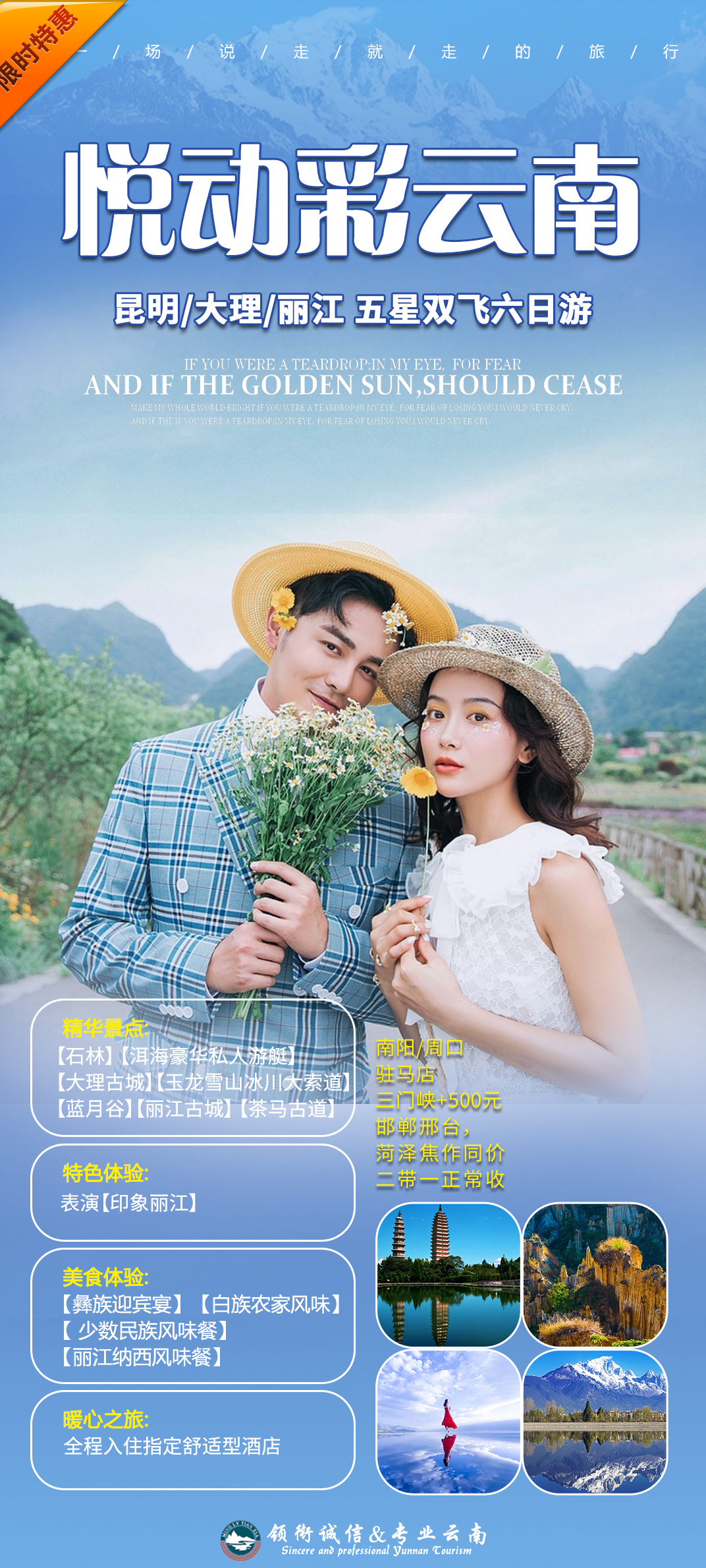 全新记忆,云南时光“一带一路”,享动云南世界那么大,我想去看看、当许多年轻人还在为没钱没时间来一场“说走就走的旅行”而懊恼不已时一群时髦的爷爷奶奶却早已经过起一边养老一边环游世界的斑斓生活......亮点1THE FIRST BRIGHT SPOT独家“全程1导+旅行管家”专职导游 24小时管家服务,售后无忧 亮点2TWO BRIGHT SPOTS“静享”温泉,“休憩时光”五星酒店+一晚温泉+一晚客栈民宿亮点3THREE BRIGHT SPOTS两大古城叁大古镇任性逛丽江古城+大理古城+束河古镇+双廊古镇+喜洲古镇亮点4FOUR BRIGHT SPOTS景点覆盖“享你所想”A餐:大石林+卡拉OK“随性”畅饮+玉龙雪山冰川公园大索道+张艺谋大型演出【印象丽江】 花海网红拍摄地+jeep车 +洱海游船+南诏风情岛+篝火晚会B餐:西山龙门索道+云南第一湖滇池+花海网红拍摄地+jeep车 +洱海游船+南诏风情岛+拉市海+木府 亮点5FIFTH BRIGHT SPOTS动车去程,两小时直达省去4小时车程,保持体力......亮点6SIX BRIGHT SPOTS五大美食“口水流”A餐:卡拉OK迎宾宴+白族风味餐+BBQ+雪厨自助餐+洱海砂锅鱼+古城过桥米线B餐:白族风味餐+BBQ+土鸡火锅+洱海砂锅鱼+古城过桥米线亮点7SEVEN BRIGHT SPOTS云南伴手礼旅游三宝(报名每人均可享受)