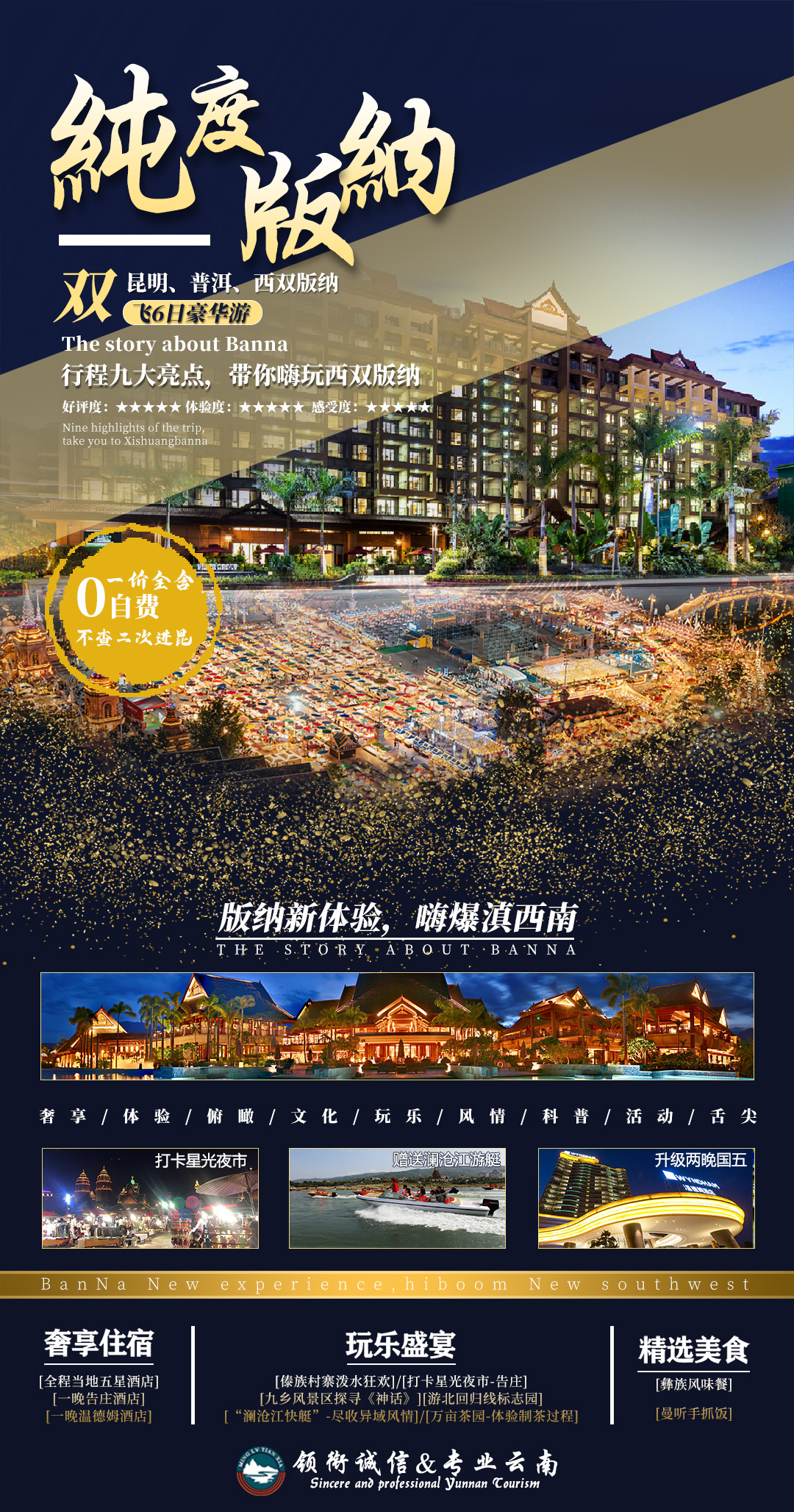 ★ 一 起 来 探 索 版 纳 的 秘 密 ★探索秘密⑴:“寻找自己的星座”天文知识科普体验。探索秘密⑵:做一次王室的公主和王子 学习“王室礼仪 ” 增添人生见识和乐趣。探索秘密⑶:“寻景”比赛增加亲情交流互动体验探索秘密⑷:做一次真正的傣家人 提供儿童“傣装一日体验”探索秘密⑸:“植物科普·亲近大自然”植物拼图探索秘密⑹: 抖音推荐网红告庄夜市“体验摆摊”做一次小小销售员探索秘密⑺:做一次“大象医生”为大象体检探索秘密⑻:色彩感知能力挥舞画笔“彩绘小象”探索秘密⑼:如升级三飞赠送景点“大佛寺 ”★ 探 索 秘 密 版 纳 的 味 蕾 ★探索秘密⑽大象水果餐+探索秘密⑾傣王御宴+探索秘密⑿孔雀宴★ 版 纳 的 住 宿 ★ 四晚精品酒店+升级一晚告庄泳池酒店,与舒适相撞,让美梦相伴~ ★ 探 索 秘 密 版 纳 的 出 行 ★行程中使用陆地头等舱 2+1豪华旅游大巴 移动的五星级酒店, 配备USB接口让您的手机随时有电!