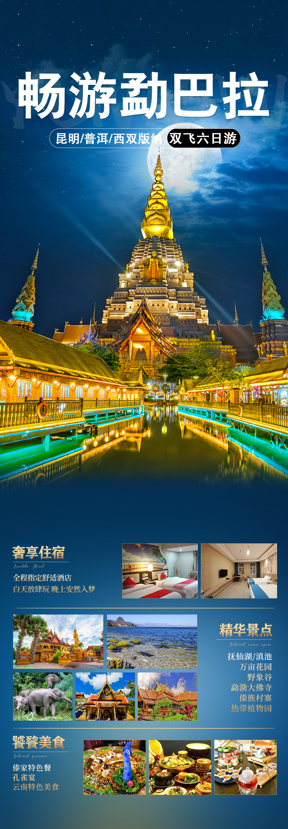 舒适酒店 膳食 傣家特色餐+傣味手抓饭(孔雀宴) 服务每一项细节,都是为了让您的旅途更加顺利,更加舒适,更加温馨:◎专业接送机,随到随走;◎确保整车有10%的空座率;尊贵品质 全程无缝隙链接,让你感受不一样的西双版纳,陶醉在傣族哨多哩热情里。 精选景点 我们精心推荐的每一个景点,都是您版纳之行不可缺少的地方:◎野象谷 探寻大象的足迹,了解亚洲象的生活,感受雨林的气息。◎抚仙湖 全国第二深淡水湖◎北标园 爱国主义教育,科普教育基地◎勐泐大佛寺 南传佛教的典型代表,感受泼水活动,孔雀放飞。◎热带植物园 植物王国凤冠霞帔上最璀璨的绿宝石。◎傣族村寨 进入傣族家里听听傣族的故事,生活习惯 。