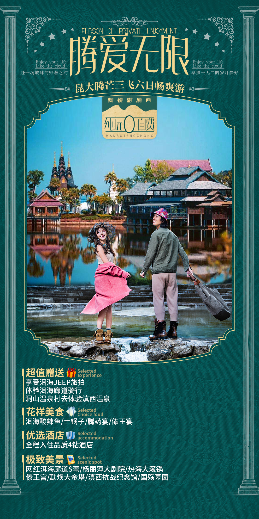 必打卡:网红洱海廊道S弯+杨丽萍大剧院+热海景区.大滚锅 ☞去生活必体验:洱海JEEP旅拍+洱海廊道骑行 ☞去放肆佛傣文化:傣王宫+勐焕大金塔 ☞去感受滇西历史:滇西抗战纪念馆+国殇墓园 ☞去体悟极边淘宝:边贸集市 ☞去淘宝滇西技艺:龙陵雕刻技艺学校 ☞去观摩滇西温泉:洞山温泉村 ☞腾出空严选美食:洱海酸辣鱼+土锅子+腾药宴+傣王宴严选酒店:品质4钻酒店赠送回忆:洱海JEEP旅拍电子照片舒心安排:滇西飞昆明 劲省10小时车程