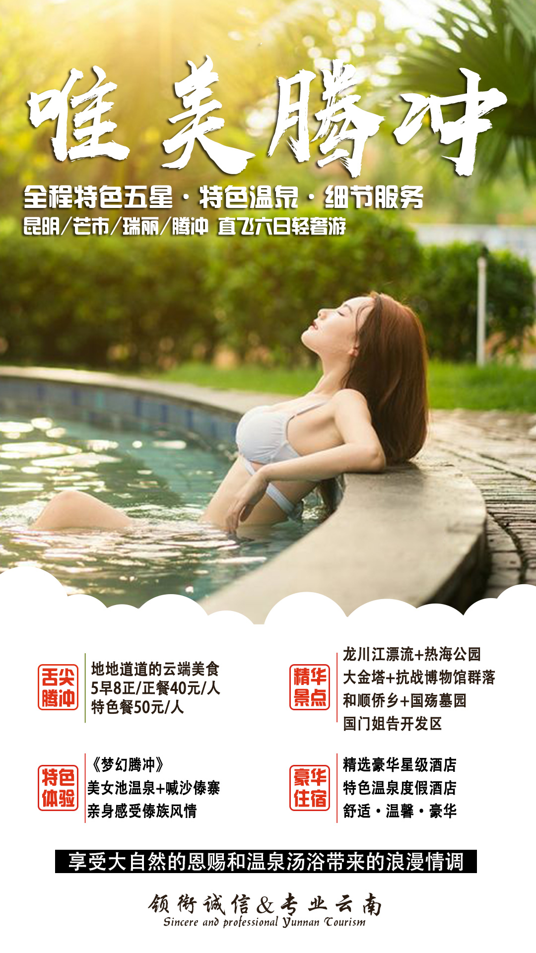 1、 跟着电影游腾冲:这里绿不谢翠,花不停开,火山、热海的奇丽壮美、承载抗战历史、宏扬民族精神的国殇墓园、热带边陲小镇畹町、“有一个美丽的地方”瑞丽芒市中缅边境的柔美神秘......《滇西1944》、《玉观音》、《翡翠凤凰》、《我的团长我的团》、《北京爱情故事》、《武侠》等数之不尽的影视作品均拍摄于此。这里是寻访前世今生,一生必到一次的地方!2、 神秘的玉石渊源:腾越是流淌在茫茫林海中蜿蜒崎岖商道上马帮驮来的一块翡翠,腾冲人采玉、琢玉、市玉的历史已愈千年,琥珀牌坊玉石桥,明清时期这里已成为玉石加工贸易集散地,在腾冲街头拆迁的废墟中,许多人找寻过去加工残留的碎玉,历年来仅此收集的碎玉就有上千吨之多,现在仍然是西南最大的玉石集散地。3、 细品腾越文化:一步一美景,一景一传奇的腾越味道是开放和复合的,是中原文化、南诏文化、东南亚文化、南亚文化、边疆少数民族文化和抗战文化的多元结合体。她是“极边第一城”、“云南第一侨乡”、“书礼名邦”、“翡翠之城”。每一处自然景观都鬼斧神工,每一座人文建筑都是历史记忆的聚合,每一寸土地都洋溢着古老的文化底蕴。4、 酒店经过精挑细选,保障乐享睡眠无忧:全程当地五星标准酒店+一晚千里走单骑特色客栈酒店,安享旅途睡眠无忧。5、 原汁原味,腾越美食穿插其中,融入腾越当地生活:孔雀宴、菠萝饭、簸箕宴、傣家风味、腾越老味道、大烟炖鸡、大薄片、稀豆粉、大救驾…原始鲜香的极边美食震撼你挑剔的味蕾!6、 温泉时光:在腾冲休眠火山群里遍布水质晶莹润滑的温泉,静静享受温泉水滑洗凝脂的惬意是腾冲旅游的标配。7、旅途加分计划:全程无自费项目。