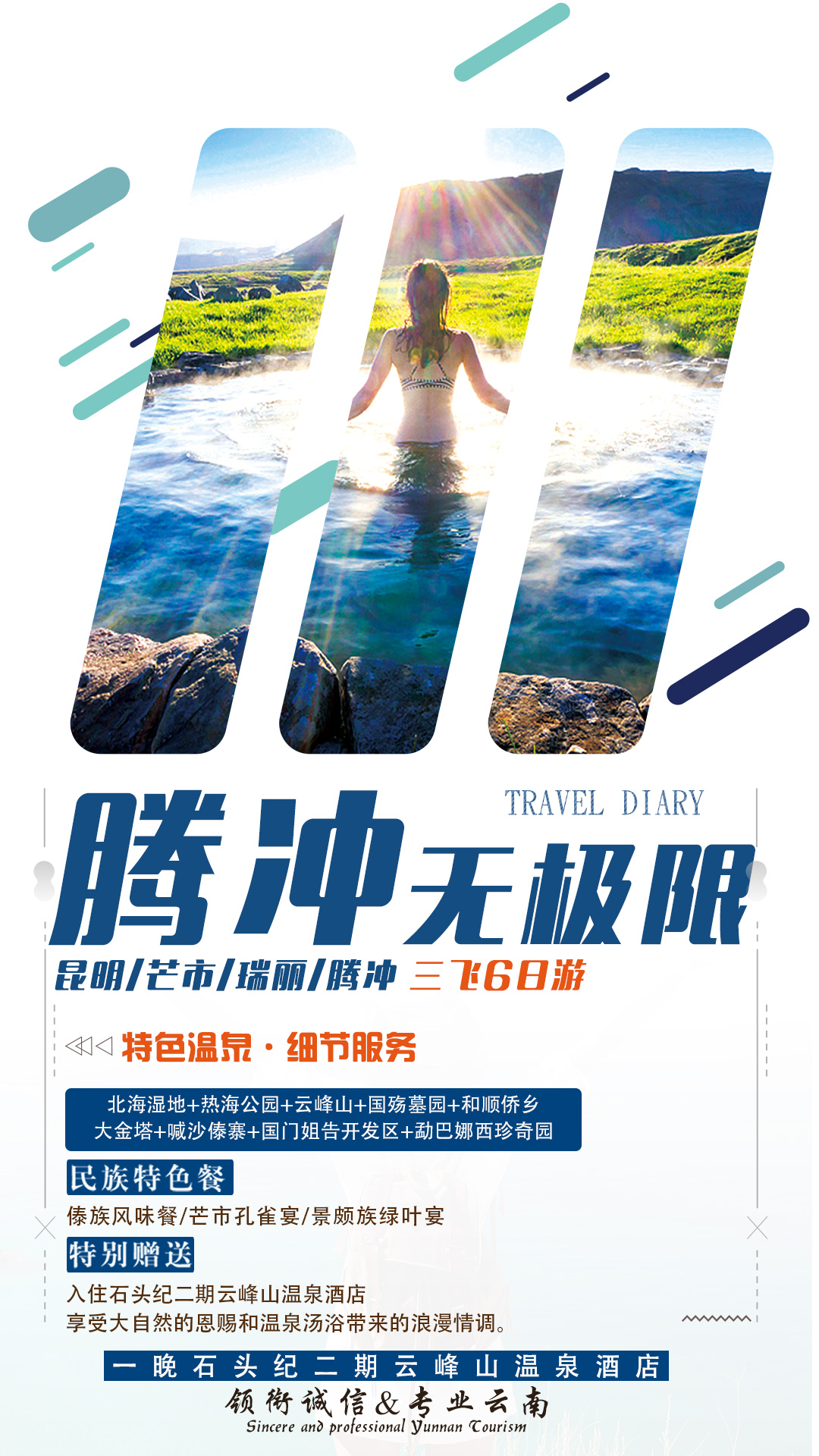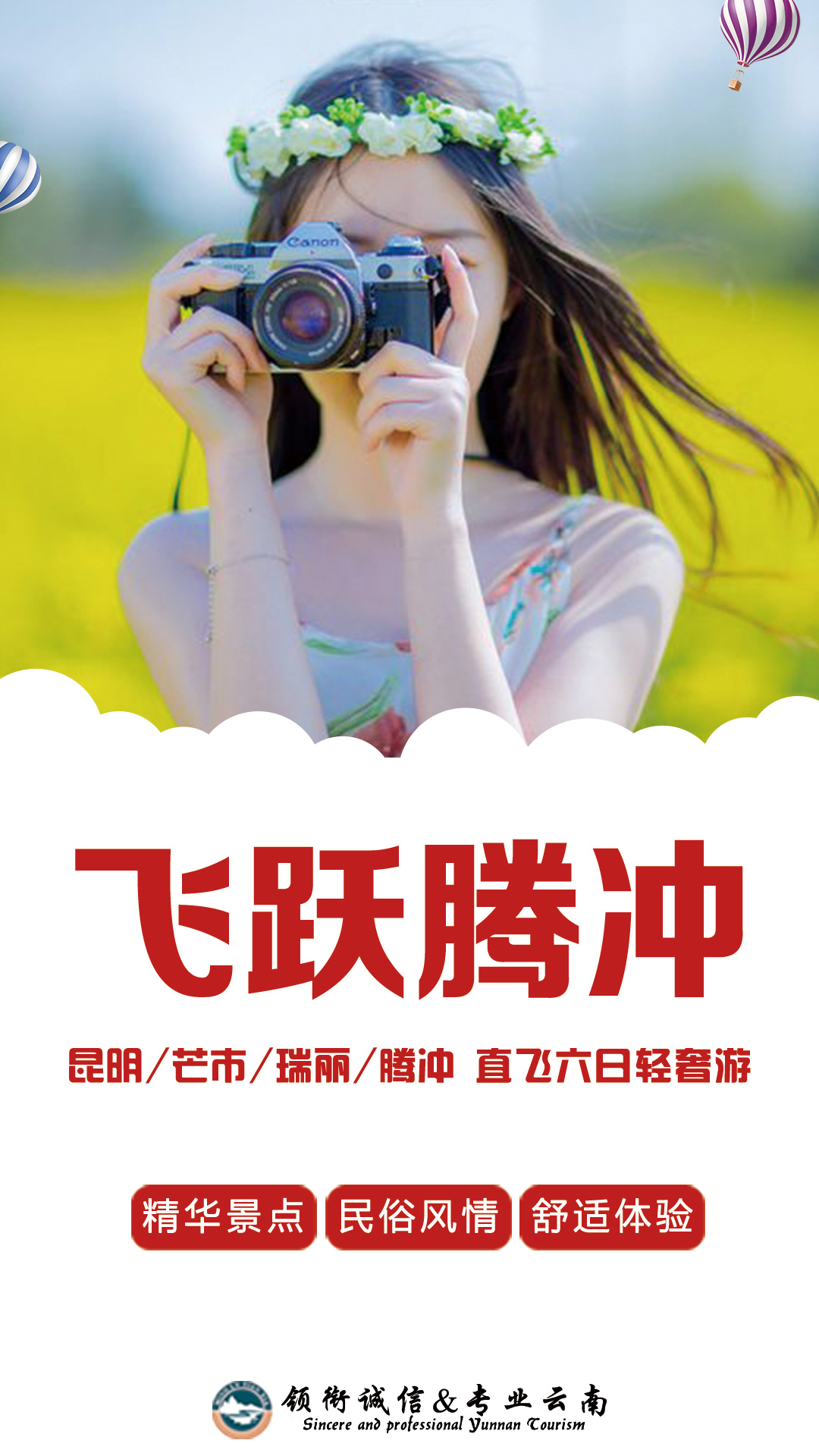 一个花开成了云,云也长成了花的国度,超乎想象的静谧与美丽,走过极边之地,穿越故国小巷,尝过就不会忘的味道,温暖的像拥抱,快乐那么好,无数的理由让人们对这里充满向往与遐想……★精华景点★仙境热海:恰似走入纯净的大自然,每一个冒出白雾的地方,都是一个天然地热出口拜谒国殇:一段不可忘却的历史,缅怀-致敬-真实-震撼辉煌金塔:山巅建造,耀眼夺目,精雕细琢,处处得见虔诚的信徒,回首连连信仰的壮观边境喊沙:恬淡乡村,微风习习,倚栏而望,碧绿辽远,喊沙傣寨入画来姐告掠影:瑞丽江对岸唯一一块“飞地”,这么近,那么远★极致体验★ 全长5.20公里的珍爱漂流,一江碧水,随风诗和,双目所及之处均是良田美景★舌尖享受★ 味蕾和视觉的冲击,手抓饭、孔雀宴★舒心旅程★ 省内单程飞机,省略腾冲至昆明800多公里路程,免去舟车劳累