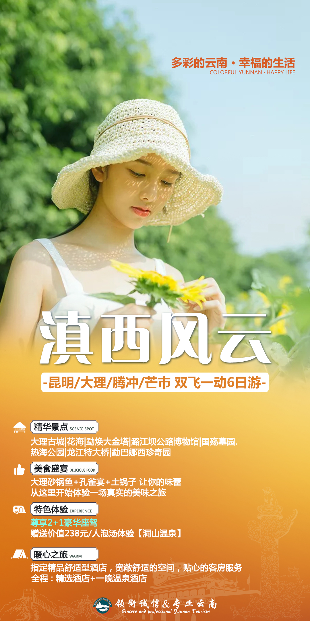 昆明、大理、腾冲、瑞丽、芒市双飞一动6日游头等精彩 ▎听见自由 ▎听懂腾冲摆脱城市“笼居”生活,打造旅行独家记忆旅行,从不将就,时光知味,体验才是旅行的精髓体验度定制 | 满足你出逃的所有愿望,每一项细节,都精心考量,只为让旅途体验更舒适不舟车劳顿 | 省去5h的车程颠簸,昆明大理动车让旅行变得轻松、舒适、奢华舒适度飙升 | 讲究里程与舒适度的完美搭配,别具一格的出行方式才能与您高贵气质相匹配乐享酒店:温泉融入清风,在这里日子,连时光都变得柔软了旅程心定制 | 酒店全新升级,全程精选品质住宿美好宿时光 | 瑞丽温泉酒店,天然地热资源优势,打造全新的温泉体验乐享餐饮:只迎合你的口味,原汁原香,地道美食精选大理味道 | 大理风味餐,一餐一食都是白族人家特色的传承推崇滇西风味 | 手抓饭+孔雀宴+土锅子,不慌不忙,寻觅滇西美味完美人文:风韵牵动了万缕繁华,送你一片月光,看见这片土地人文盛宴 | 滇西最具故事性歌舞盛宴,边城绝唱—《梦幻腾冲》愉悦体验 | 吉普车旅拍,和最拉风的吉普车一起凹造型,留下酷炫的旅途照片乐享景区:还原旅行本真,只做精致的旅游生活家!震撼滇西 | 勐焕大金塔+姐告国门+勐巴娜西珍奇园完美滇西 | 国殇墓园+滇缅公路+热海景区+龙江大桥滇西拾光 | 一季一景,精选北海湿地,好玩时光大放送乐享行程概览:【D1】全国各地—昆明.长水国际机场—住昆明【D2】动车下大理—吉普车—乘车前往腾冲—梦幻腾冲—住腾冲【D3】国殇墓园—热海(不含电瓶车)—北海湿地(不含游船)—瑞丽—住瑞丽温泉酒店【D4】文化产业园—姐告国门—咖啡庄园—勐巴娜西珍奇园—大金塔—住芒市【D5】傣王宫黄龙玉—滇缅公路—龙江大桥—住楚雄【D6】楚雄—昆明—集散中心—昆明.长水国际机场—乘机返回温馨的家