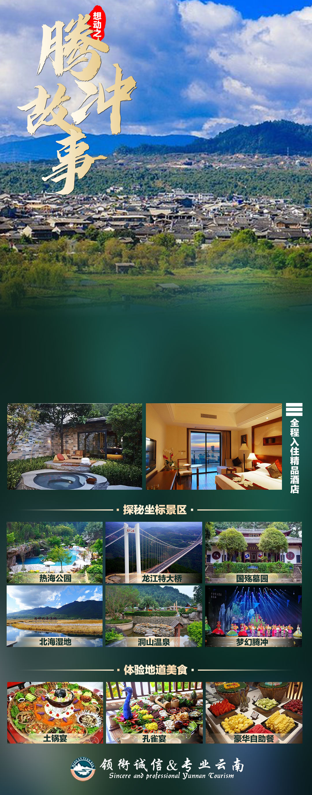 ▲精品景点设计● 芒市标志性的建筑【勐焕大金塔】● 亚热带物种基因库【勐巴娜西珍奇园】● 云南省德宏州瑞丽姐告边境贸易区国门【瑞丽姐告国门】● 腾冲最有名的火山地质奇景【热海景区】● 云南省唯一的国家湿地保护区【北海湿地公园】或天下第一银杏王国——【银杏村】● 全国建立最早、规模宏大的抗日烈士陵园,建爱国主义教育基地--【国殇墓园】●边城绝唱大型歌舞视觉盛宴《梦幻腾冲》●天然地热温泉泡澡【洞山温泉SPA】▲专属菜品云南美食,拥有一种藏在山水间的原味,就地取材,却不同食法。料广,色美,型巧,味全,看者胃开,闻者流涎,食者回味……月光城专属菜品,让你的味蕾,从这里开始体验一场真实的美味之旅。▲惬意住宿指定精品舒适型酒店,宽敞舒适的空间,贴心的客房服务,让您在舒逸的环境中安枕无忧,蓄精养神以迎接第二天精彩的行程。▲出行设计空调旅游大巴,一人一正座。知识渊博、幽默的导游将带你一同游行趣味云南,为您提供专业导游服务的同时贴心为您解决旅程所遇一切问题;驾龄丰富的司机将为此趟精彩行程保驾护航,让您乘坐安心。我们为每一位游客购买云南旅游组合保险,多重安全保障,让您出行无忧。▲私人专属享受双温泉【天然洞山温泉】+一晚温泉酒店(请自备泳衣);其水富含硅酸及多种微量元素,对风湿病、关节炎及皮肤病有较好疗效,一直是当地人洗浴强身的温泉灵汤,被称为“温泉之宝”!