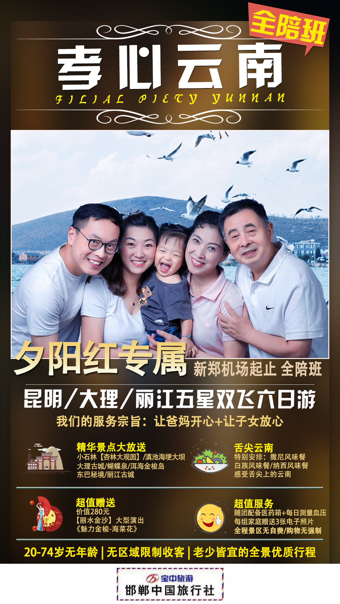 1 :产品理念——为老年人专属定制的高端夕阳红产品,让爸妈开心、让子女放心是我们的服务宗旨;2 :三大主题【寻找最美夕阳-有奖才艺大赛】【大理地热温泉康养】【丽江金塔大师祈福】3 :景点——5A石林、大理古城、洱源西湖、玉龙雪山、丽江古城、金塔、大理白族民居、紫溪彝村、野象谷、原始森林公园;4 :娱乐——乘特色游船赏洱源风光,观赏《洱海鱼鹰》表演,特别赠送纳西家访+篝火晚会+纳西盛装摆拍;5 :美食——特别安排撒呢风味餐+白族风味餐+纳西风味餐,感受舌尖上的云南;6 :服务——新郑机场起止全程导游陪同+云南当地优秀地接导游服务+24小时旅游管家质量监督,全程零衔接;7 :贴心——随团配备医药箱,50岁以上老人每天至少测量一次血压,行程中每人每天赠送一瓶矿泉水;8 :自费——昆大丽全程景区无自费,全程购物无强制消费,明明白白消费;版纳段自愿参加;9 :记忆——每组家庭赠送1张家庭合影+三张以上电子版照片,记录旅途中的幸福快乐时光;10 : 超值赠送——丽江+大理古维费80元+石林电瓶车25元+蓝月谷电瓶车50元+大理古城电瓶车35元/人;11:适合人群——20-75岁无年龄、无区域限制收客,老少皆宜的全景优质行程;12:神秘礼包:报名即送保障型旅行三宝(雨伞+口罩+便携式餐具实用安全细致周到)