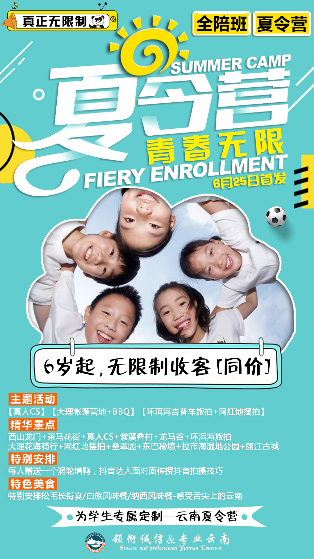 1 :产品理念——为学生专属定制的高端云南夏令营产品,让孩子开心、让家长放心是我们的服务宗旨;2 :三大主题活动【真人CS】【大理帐篷营地+BBQ】【环洱海吉普车旅拍+网红地摆拍】3 :景点——西山龙门、茶马花街、真人CS、紫溪彝村、龙马谷、环洱海旅拍、大理花海骑行、网红地摆拍、垒翠园、东巴秘境、拉市海湿地公园、丽江古城;4 :美食——特别安排松毛长街宴/白族风味餐/纳西风味餐,感受舌尖上的云南;6 :研学——特别安排龙马谷农耕体验寓教于乐、宝贝们可以在辅导员的带领下可亲手制作大理特色美食;5 :服务——新郑机场起止全程导游陪同+云南当地优秀地接导游服务+24小时旅游管家质量监督,全程零衔接;6 :贴心——随团配备医药箱,随时呵护游客的健康,每人每天赠送一瓶矿泉水全程共四瓶/人;7 :购物——全程1个景中店+1个集散中心,购物无强制消费;8 :特别安排——每人赠送一个涡轮增鸭,抖音达人面对面传授抖音拍摄技巧;9 :适合人群——6岁至69岁无年龄、无区域限制收客,毕业季优质云南行程;