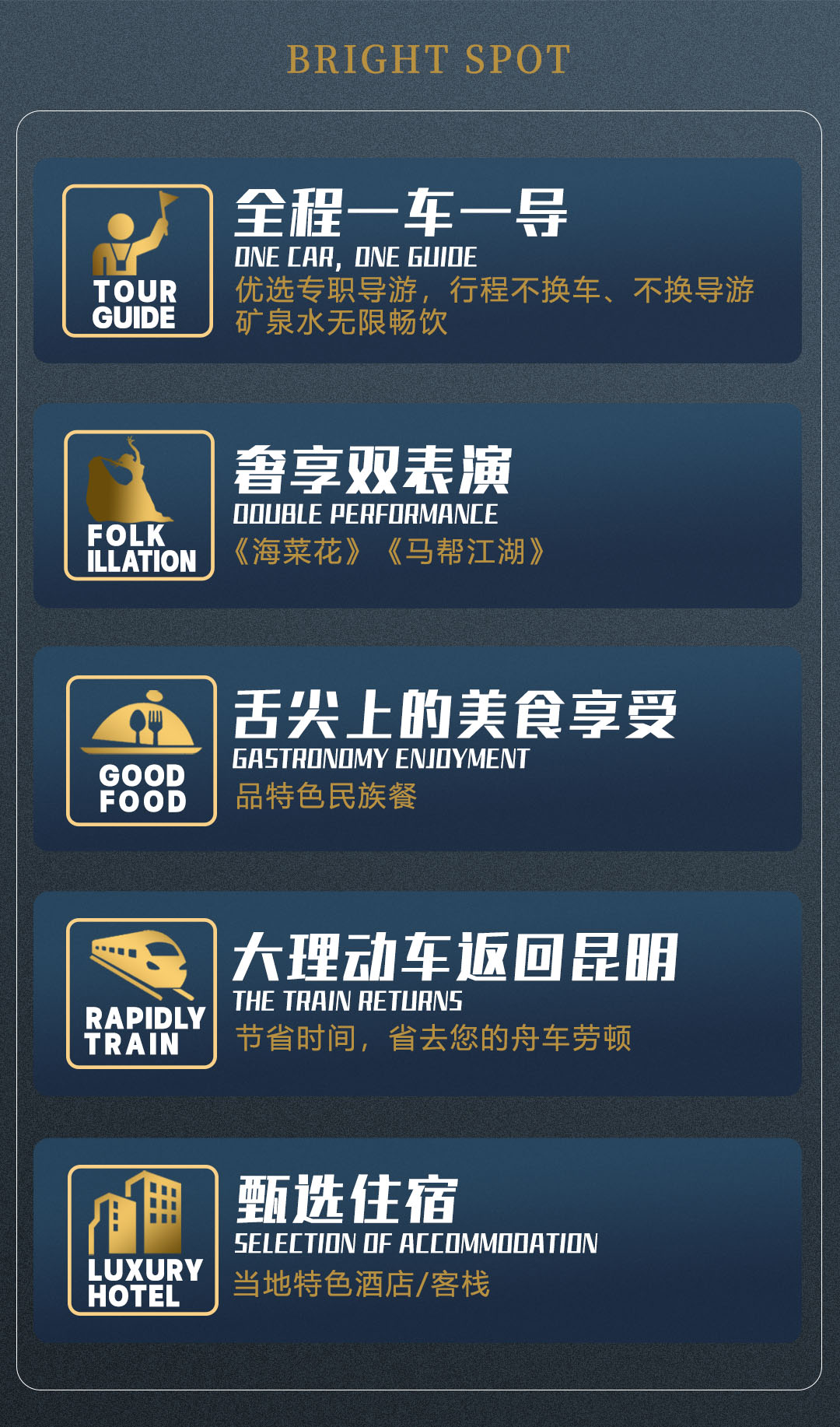 ● 全程空调旅游大巴,一人一正座。知识渊博、幽默的导游将带你一同游行趣味云南,为您提供专业导游服务的同时贴心为您解决旅程所遇一切问题;驾龄丰富的司机将为此趟精彩行程保驾护航,让您乘坐安心。