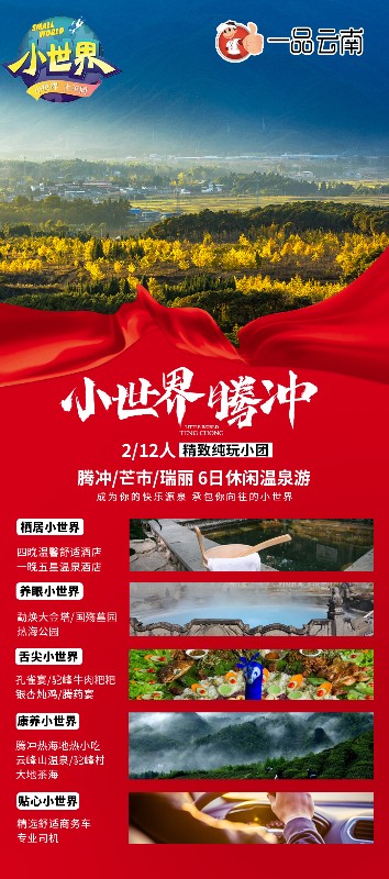 四晚舒适温馨酒店+一晚五星温泉酒店——腾冲云峰山温泉酒店,每晚安排不同的感受让旅途的疲劳在您安逸的睡眠中消失。极美的景致找个小世界