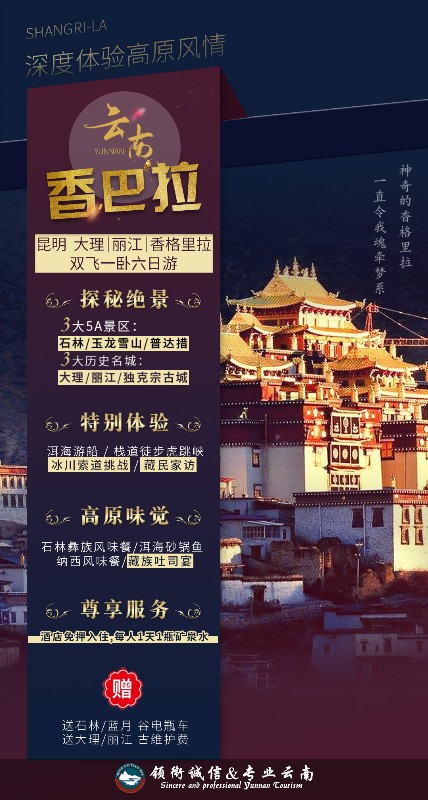 ● 不虚此行:来云南,要不虚此行。香巴拉,让您六天时间,玩遍昆明、大理、丽江、香格里拉。