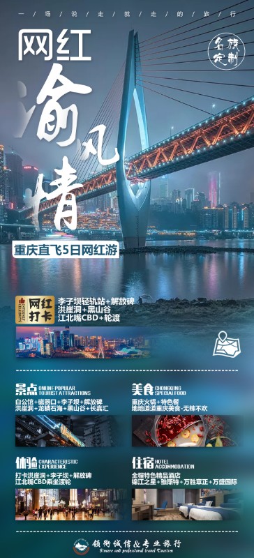 酒店早餐后,乘车前往红岩烈士纪念地(车程30分钟)——游览【白公馆】游览时间不低于40分钟】。白公馆原为四川军阀白驹的郊外别墅。1939年国民党军统局将此改建为监狱关押“政治犯”。前往游览中国千年古镇--【磁器口古镇】游览时间不低于60分钟】。瓷器口古镇磁器口始建于宋真宗咸平年间(公元998年),清朝初年,因盛产和转运瓷器,而得名磁器口,作为嘉陵江边重要的水陆码头,曾经“白日里千人拱手,入夜后万盏明灯”,繁盛一时,美誉为“小重庆”。后乘车前往【李子坝轻轨站】欣赏轻轨穿楼的奇观【欣赏时间不低于30分钟】。后来到重庆最美街道【中山四路】游览时间不低于30分钟】,作为中国抗战文化保存最集中的区域之一,中山四路沿街散落有桂园、周公馆、戴公馆等抗战名人遗址。这条复刻了泱泱大国如晦历史记忆的长路,自上世纪30 年代便锁定了来自世界的瞩目,并以它独一无二的城市地位,代言着城市的前世今生。后前往新晋网红景点【鹅岭二厂】游览时间不低于50分钟】,鹅岭二厂是重庆网红地标打卡地,也是在《从我的全世界路过》电影中的取景之地,哪怕是在 40℃的重庆高温下都充斥着来自全国各地的潮人,不惧烈日的炙烤也要打卡这个艺术青年的文创圣地。最后乘车前往【解放碑步行街】游览时间不低于40分钟】,解放碑步行街以抗战胜利记功碑为中心,被誉为十字金街,“中国著名商业街”、“全国特色文化广场”、“西部第一街”等称号。游览完毕后步行前往【八一路小吃街】客人自由品尝重庆美食,时间不低于60分钟】,最后入夜前往【重庆洪崖洞风景区】夜游时间不低于40分钟】,欣赏巴渝十二景之洪崖滴翠,感受张恨水笔下“最奇特的建筑物”吊脚楼的恢弘气势,领略重庆独有的人文精髓。游览完毕后入住酒店休息!