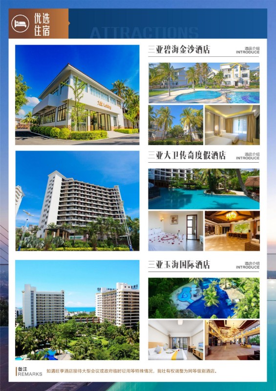 1、海南酒店标准可能会比内地偏低,敬请谅解;如遇旺季酒店资源紧张或政府临时征用等特殊情况,我社有权调整为同等级标准酒店,全程不提供自然单间,如出现单男单女或单人,请补齐单房差或加床(注:加床原则为钢丝床);酒店退房时间为中午12:00时,返程为晚班机的游客可把行李寄存在酒店前台后自由活动或自行开钟点房休息。