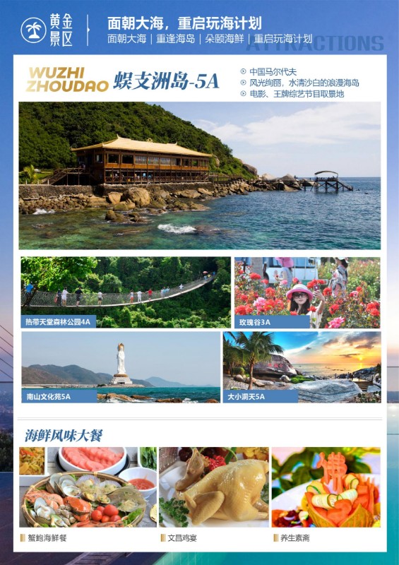 精选景区:蜈支洲岛5A、南山文化苑5A、大小洞天5A、热带天堂森林公园4A、玫瑰谷、 三亚海旅免税城
