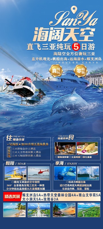 行程特色:全程零购物纯玩专享;海陆空全方位,上天入海,奢玩三亚!直升机观光+帆船出海+远海潜水+蜈支洲岛等海南热门景区,海南正宗特色餐舌尖过足瘾,元气满满畅快撒欢!