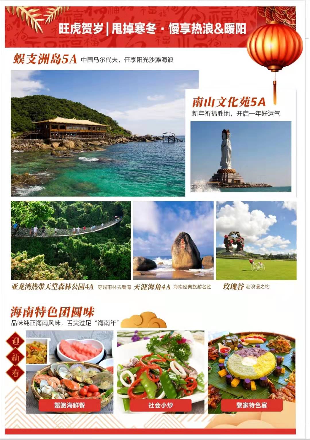 行程特色:春节游性价比之王,一价全包;游爆款旅行目的地—“国际旅游城市”三亚;避霾避寒胜地,25℃温暖过年;网红景区闹新春,蜈支洲岛嗨玩,零距离深度亲海;打卡三亚网红夜游地;享鲜美海鲜大咖餐,品尝地道特色美食