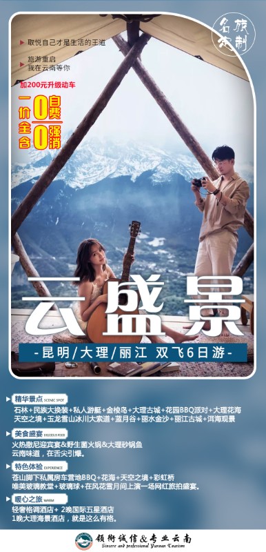 特别安排 “民族大换装”,阿细跳月是撒尼人最具代表性的民族民间舞蹈,弹起大三弦、拉起手、跺跺脚、换上撒尼人的服装(每人含一套服饰),做一回本真激情的阿黑哥和阿诗玛。