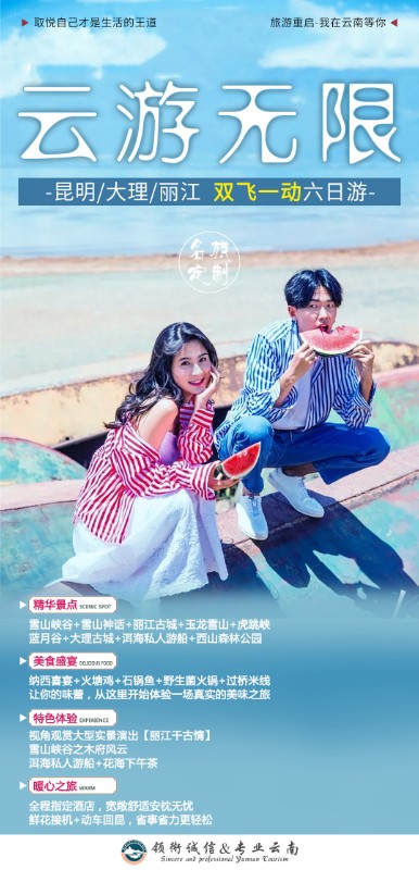 23、云南地处云贵高原,每天昼夜温差较大(12—15摄氏度),请出团前了解当地天气情况,注意着装注意当地天气预报,请带足保暖防寒衣物,云南日照强,紫外线强。长时间在户外活动,请戴上太阳帽,太阳镜,涂抹防晒霜,以保护皮肤,天气变化多端,请携带雨具。
