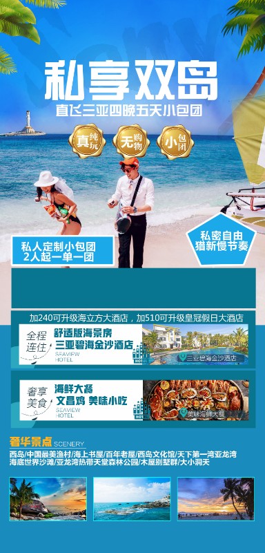 7、蜈支洲岛景区因集中上岛游客较多,团队上岛可能会造成排队等候时间过长;分界洲岛、西岛、蜈支洲岛景区规定60岁以上及行动不便游客(包括孕妇)需填写景区的免责声明方可登船上岛;70周岁以上老年人出于安全考虑,景区不予安排上岛参观(我社按团队采购成本价格予以退费)。