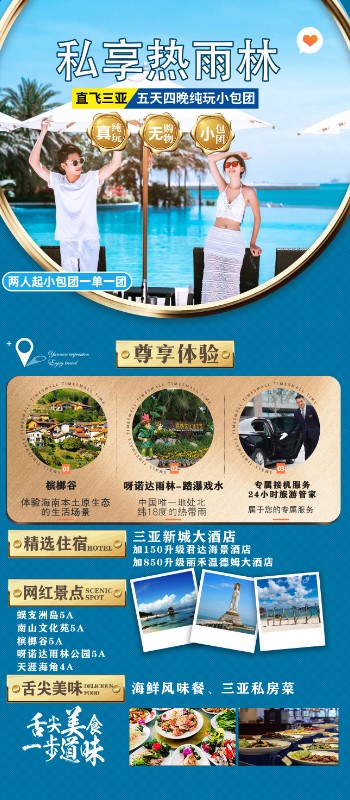 ①玩:上天入海,任我翱翔;岛上四周海域清澈透明,海水能见度6—27米,南部水域海底有着保护很好的珊瑚礁,是世界上为数不多的没有礁石或者鹅卵石混杂的海岛,海底珊瑚五彩斑斓,美丽的热带鱼四处游荡,这里是公认的中国潜海胜地;②景:前往冯小刚贺岁喜剧《私人订制》外景拍摄地,重温电影画面;③情:情人桥,一吻定情,终成眷属;④拍:这里沙滩、阳光、碧水,绿树构成一幅美丽的滨海风光,随手一拍都是天然无需滤镜的美照,朋友圈刷赞利器;④自由:在这里您可以体验与大海同步呼吸,私人定制看海时间,可以嗨玩一整天哦,感受前所未有的自由,把海看够玩够!(海上项目自理)。