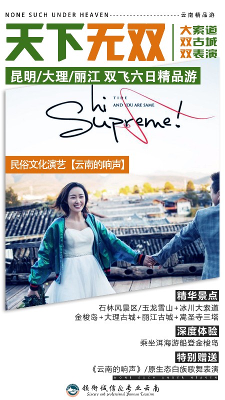 酒店享用早餐后,乘车前往云南特产展示中心,游览结束后乘车前往玉龙雪山,乘坐【冰川大索道】游览【玉龙雪山】,玉龙雪山是北半球最南的大雪山,形如矫健的玉龙横卧山巅,山脚下绿草遍地,山顶上终年积雪,不仅巍峨壮丽,且随四时的更换,阴晴的变化,奇丽多姿。雪白山岩、银装素裹,十三座雪峰连绵不绝,宛若巨龙。云中雪峰皎洁、云下岗峦碧翠;有时碧空如水,群峰晶莹耀眼;有时霞光辉映,雪峰如披红纱。索道全长2914米,垂直高差1150米,是我国海拨最高的旅游客运索道之一。随着缆车缓缓上升,翻过一座又一座高山,能看到地貌植被的明显变化,越往高处,植被越稀少。从青葱翠绿跨到白雪皑皑,最后,到达山顶,只能依稀看到一些生命力顽强的植被。全程速度很快,坡度很陡,不仅有空间上的紧张刺激,更有来自心灵上的敬畏和震撼。随后观赏一场真正意义上的荡涤灵魂的盛宴《云南的响声》或《丽水金沙》大型民族艺术演出,后客人可以自行前往《丽江古城》自费品尝当地特色小吃,之后自行入住酒店休息