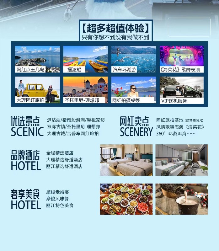 早餐后乘车前往大理,到达【大理】一路环海,远观洱海,【洱海初体验】准备迎接近距离的接触。第一站我们到达【双廊古镇】(往返双廊电瓶车自理),大理风光在沧洱,沧洱风光在双廊,双廊的景色是一个不会让人失望的地方,到达双廊参观网红点【玉几岛】,大理玉几岛是洱海三岛之一,位于洱海国家级风景区内,地处云南大理市双廊镇。它集苍洱风光之精华,有“苍洱第一村”的美誉。站在玉几岛上,远眺苍山十九峰,近观岛曲秀丽景色,手捧洱海玉液清波,一幅壮美的自然美景天然自成,令人心旷神怡。当你来到双廊镇玉几岛,你就能真切地感受到“大理风光在苍洱,苍洱风光在双廊,双廊风光在玉几岛”所言不虚。午餐之后乘车前往金梭岛,乘坐【摆渡船】前往游览美丽的大理皇家避暑行宫--【洱海金梭岛,含:游船(往返摆渡船)+洱海龙宫溶洞+大理民俗表演《海菜花》】,【龙宫风景区】欣赏白族歌舞表演,龙宫是岛内形成的天然地下溶洞、正所谓海中有岛、岛中有洞、洞中有景、美不胜收。在龙宫溶洞内欣赏【风情歌舞表演《海菜花》】以生长在洁净海水里的海菜花为主题,分为“海之花”“捕鱼舞”“撒网舞”和“鱼调”4个篇章,以金梭岛渔民世世代代在洱海打鱼、捕捞、航运的生活习俗为依托,用艺术化的手法,展现以金梭岛为代表的白族人民幸福祥和的生活,以及保护洱海、爱护环境,人与自然和谐共处的美好画卷,歌颂大理灿烂的白族文化、浓郁的民族风情、独具魅力的自然风光。之后乘车前往我们特意安排的大理打卡超网红景点、洱海的城堡--【圣托里尼-理想邦】,这里是理想的乌托邦世界,坐落在大理洱海边的圣托里尼,这里,依山而建,街道诗意蜿蜒,建筑自然生长。这里 面朝洱海,春暖花开。这里 居所与自然,极美地融合。这里 紧张和疲惫 ,不复存在,失落和无助,无影无踪。不在其中, 有一种探寻的冲动。身在其中, 有一种沉淀的安宁。晚餐后安排入住酒店休息。