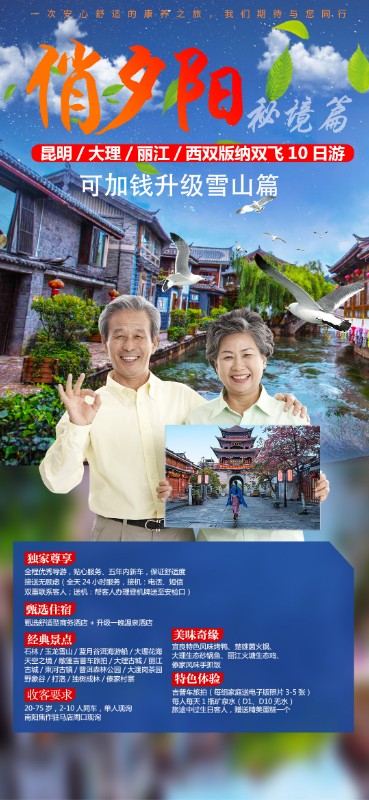 2、出行必备:出行前要穿防滑、轻便、柔软、有弹性的旅游鞋,尽可能带一手杖,以增强身体的支撑能力,有老年病的自行备好日常用药。雨衣或雨伞、防晒油、太阳帽、太阳镜等。(丽江早晚温差较大、请带稍厚衣服、建议带毛衣、长袖衫、轻便保暖外套)