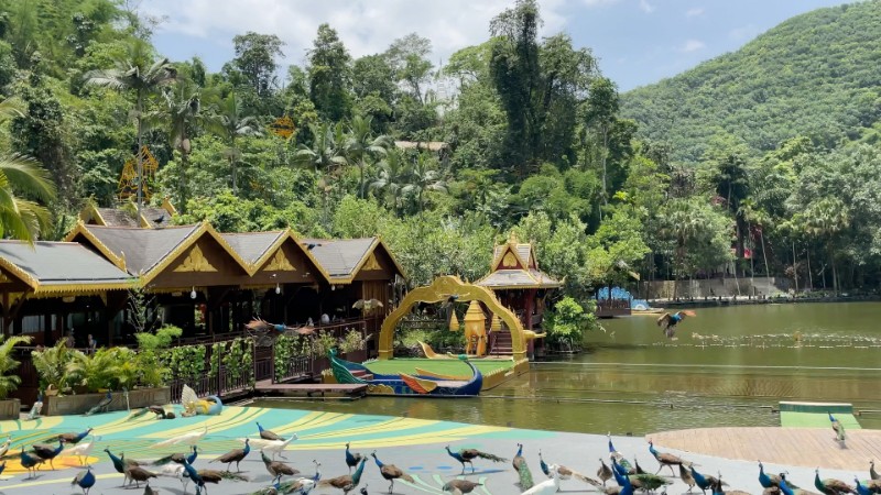 后参观西双版纳傣王的皇家寺院——国家4A级景区【勐泐大佛寺】(电瓶车40元/人自理)佛寺是在古代傣王朝的皇家寺院“景飘佛寺”的原址上修建的,以佛祖释迦牟尼的生平及佛寺活动为主线,九龙浴佛、景飘大殿、神石、国殿、吉祥大佛等有500多座佛寺、200多座佛塔。而勐泐大佛寺是所有佛寺中最大的,地位也是是至高无上的,是傣家人心目中的圣地,成为世界南传佛教的文化中心。根据时间可观千只孔雀放飞盛景,参与傣家泼水活动祈福“泼湿一身,幸福终身”