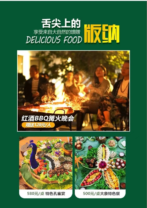 3、餐饮:孔雀宴+象餐+红酒BBQ烧烤篝火晚会;