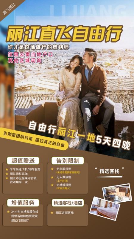 备注:本产品为自由行产品,费用包含:1、两地间的往返交通费(不含前往景区或是其他地方的车费);2、入住指定精品客栈。费用不含:各个景区(景点)门票、所有餐费以及一切个人消费。