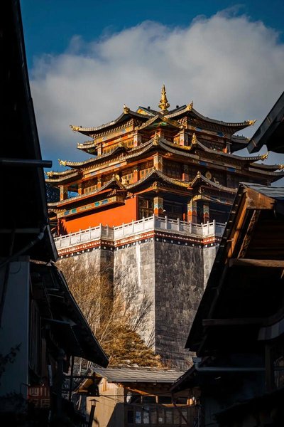 古城内的街道狭窄而曲折,两旁是古色古香的民居和商铺,这里保存着浓厚的藏族风情。在古城的巷弄中,您可以看到传统的藏族建筑,如白墙红瓦、木雕窗花、飞檐翘角等。在街上漫步,您还会听到传统的藏族音乐和歌舞表演,感受到浓厚的藏族文化氛围。在这里,人和狗都那么懒散,一起晒着太阳,感受时间流淌的痕迹,都如此地满足。