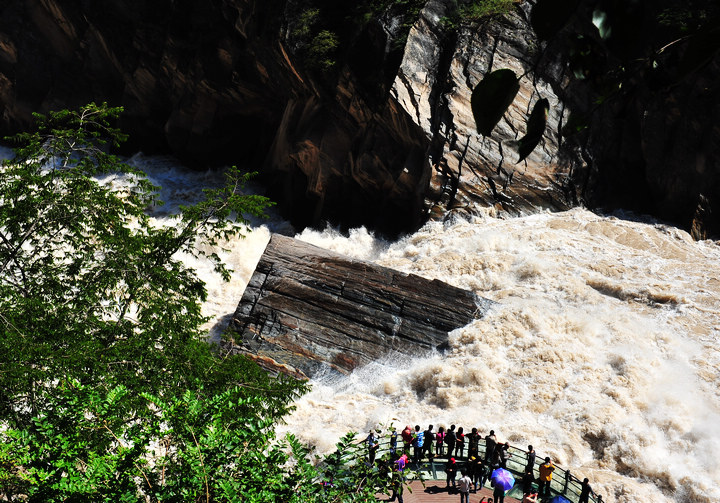 山和哈巴雪山两大名山中间,适逢雨季,滔滔江水震耳欲聋,据说很久以前有猛虎借江心中一块巨