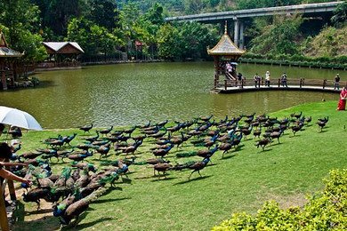 中餐后前往AAAA级景区【原始森林公园】, 车程约30分钟左右,(游览时间约180分钟,不含电瓶车60元/人)森林公园是离景洪城最近的一片原始森林。在25000亩热带沟谷雨林的基础上创建,园内森林覆盖率超过98%,是个天然的大氧吧。有沟谷雨林、孔雀飞舞、民俗歌舞、美食、泼水狂欢等项目,突出体现了“原始森林、野生动物、民族风情”三大主题。里面饲养着400多只绿孔雀,让人观赏孔雀开屏,孔雀放飞壮景。里面分布有大面积的热带沟谷雨林,游客可顺游览道深入西双版纳林中探秘。雨林内有猿猴栖息,有彩蝶繁殖,西双版纳犀鸟、野牛等珍稀物种也偶有出现。幸运的游人会遇到猿猴攀枝嬉戏、西双版纳犀鸟在林中觅食的情景。