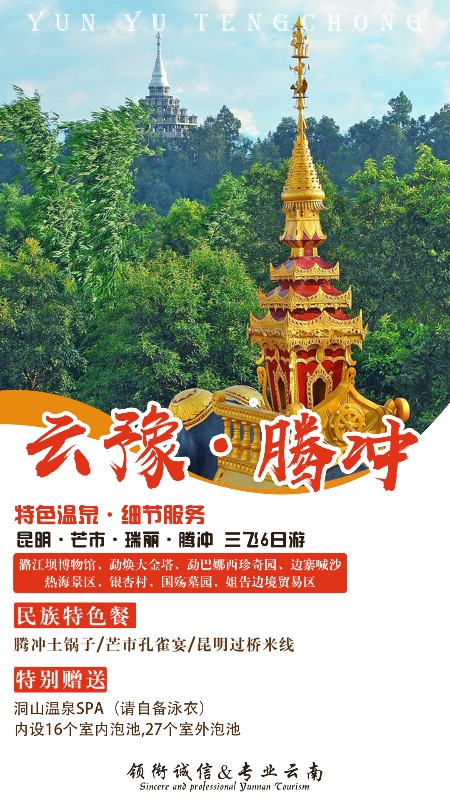 早餐后昆明乘机飞芒市或者保山,途经【潞江大桥】以其超长的单空跨度位居全国第一,亚洲第二,成为怒江州六库城区唯一一座连接东西两岸的交通命脉;后游览【潞江坝博物馆】外馆展出有二战时期的载货卡车,坦克,内管展出历史文物,让游人回顾历史,缅怀先烈,成为了休闲娱乐的好去处,后乘车至腾冲,参观【热海公园】(游览时间90分钟左右)游览大滚锅,在这里你会亲眼看到云南十八怪之鸡蛋拴着卖,蛤蟆嘴、珍珠泉、姐妹泉,怀胎井等地热奇观,后赠送享受【洞山温泉SPA】(请自备泳衣)内设16个室内泡池,27个室外泡池。晚餐后入住酒店。