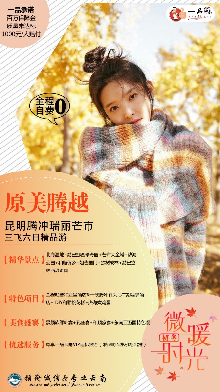 2、云南地处云贵高原,一里不同俗十里不同天,气候变化较快,请出团前注意当地天气预报。请出团前注意当地天气预报。云南地处云贵高原,当地昼夜温差大,请带足保暖防寒衣物,云南日照强,紫外线强。长时间在户外活动,请戴上太阳帽、太阳镜,涂抹防霜,以保护皮肤。天气变化多端,请携带雨具。