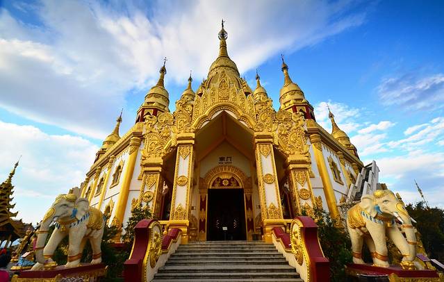早餐后乘车至瑞丽,前往游览【勐焕大金塔】它坐落于云南省德宏州芒市城区东南方——孔雀湖畔的雷崖让山之巅,勐焕大金塔属南亚傣王宫的建筑风格,金光灿灿,雄伟壮观,也是傣族人民信仰的小乘佛教圣地之一;