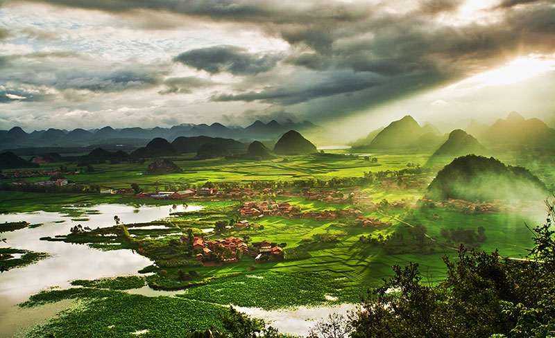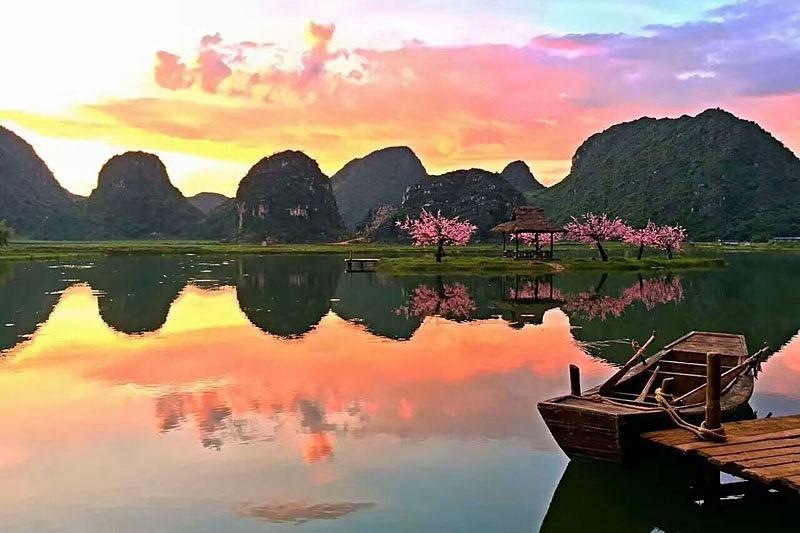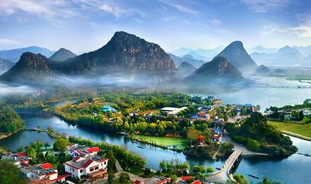 文山州丘北普者黑景区,其位于云南省文山壮族苗族自治州丘北县境内,属于滇东南岩溶区,是发育典型的喀斯特岩溶地貌,以“水上田园、湖泊峰林、彝家水乡、岩溶湿地、荷花世界、候鸟天堂”六大景观而著称。