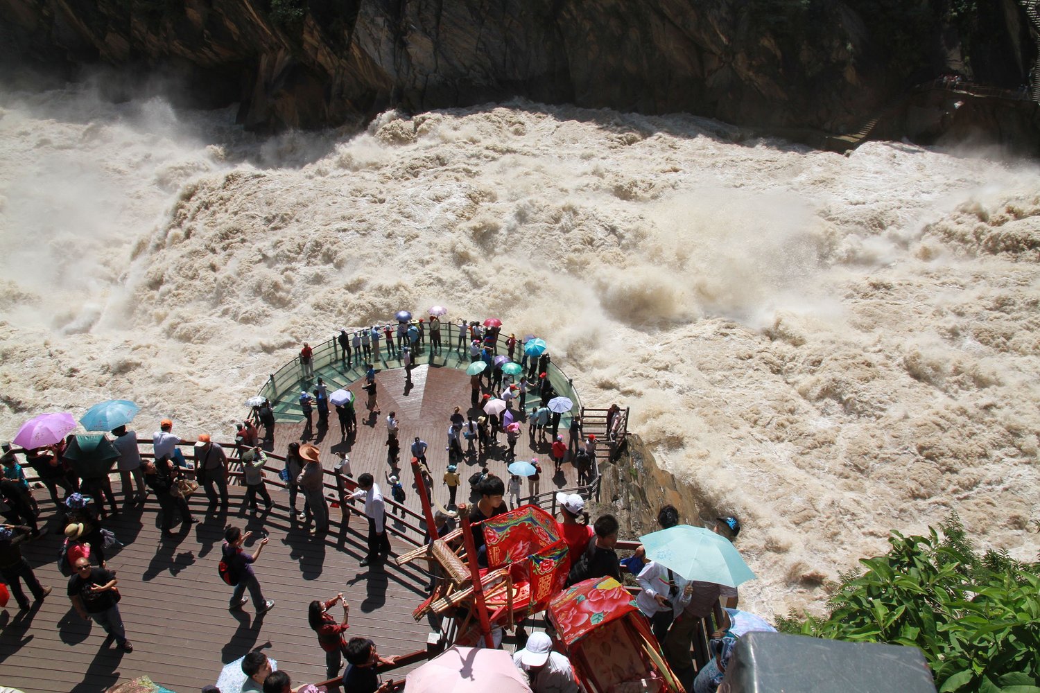 后乘车赴国家AAAA级旅游风景名胜区【虎跳峡】(电梯单程50元/人,往返70元/人自愿自费),虎跳峡是世界上著名的大峡谷,以“险”闻名天下,是中国最深的峡谷之一。虎跳峡一向以“险”而闻名天下。分为上虎跳、中虎跳下虎跳3段,多处险滩,江水在玉龙、哈巴两座雪山的夹峙下奔流向前,气势不凡。峡谷两岸,高山耸峙,谷坡陡峭,虎跳峡的上峡口海拔1800米,下峡口海拔1630米,从上虎跳峡至下峡口,落差达210米,两岸山岭和江面相差2500-3000米,平均每千米14米,江流特急,不少段落,每秒达六至八米,因而江水态势,瞬息万变,或狂驰怒号,石乱水激,雪浪翻飞;或旋涡漫卷,飞瀑轰鸣,雾气空蒙,构成世上罕见的山水奇观。