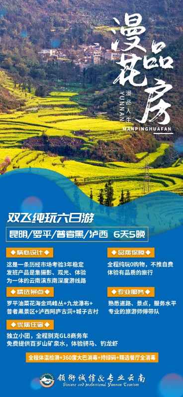 备注:云南罗平县油菜花为季节性景观,因温度及湿度等气候原因导致花期长短不确定,一般花期时间大约为2月--3月初左右,如因花期导致欣赏不了油菜花风光,我社将行程调整如下:金鸡峰丛、螺丝田换成【多依河】景点,赏多依河上布依族风情!