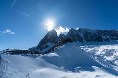 贵宾按照提前约定时间起床,指定时间出发去【玉龙雪山】,乘坐雪山专线环保车至【冰川大索道】乘坐点,抵达【冰川公园】(每人赠送1套衣服氧气不用不退)乘大索道至海拔4506米观景区,客人可以根据自身体力情况登级至4680米,一览众山小。之后前往 “仙人遗田”之称的小九寨沟【蓝月谷】(赠送电瓶车不用不退),其前身为人们所熟知的 “白水河”,蓝月谷又名白水河,在晴天时,水的颜色是蓝色的,而且山谷呈月牙形,远看就象一轮蓝色的月亮镶嵌在玉龙雪山脚下,所以名叫蓝月谷。(如因索道停运无法安排冰川大索道则安排云杉坪索道或者牦牛坪索道退差价)