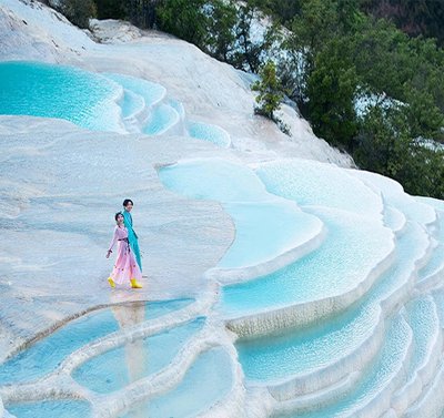 后前往【白水台】白水台是中国目前发现的最大规模冷泉型淡水碳酸盐泉华台地,其成因是泉水中的碳酸钙在阳光照射下经过漫长岁月的沉淀,形成层层叠叠的白色梯田状地貌,因此也被称为“仙人遗田”。