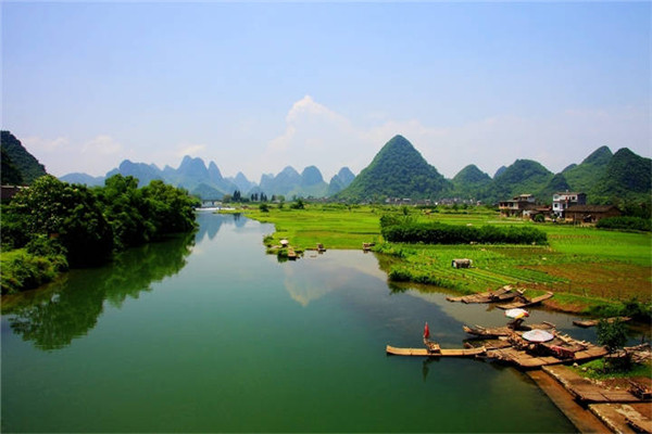 漫步游览【遇龙河风光】,遇龙河两岸山峰清秀迤逦,连绵起伏,形态万千,江岸绿草如茵,翠竹葱郁,树木繁荫。遇龙河的水如同绿色的翡翠,清澈透亮,鱼儿闲游,水筏飘摇,一一可见。微风拂过水面,泛起阵阵涟漪,如同小提琴奏出的音符,静静的,轻轻的。整个遇龙河景区,没有任何所谓现代化建筑,没有任何人工雕琢痕迹,没有任何一点都市喧嚣,一切都是那么原始、自然、古朴、纯净,实为桂林地区最大的纯自然山水园地。如果把漓江比成"大家闺秀",那么遇龙河则是让人怦然心动的"小家碧玉"。