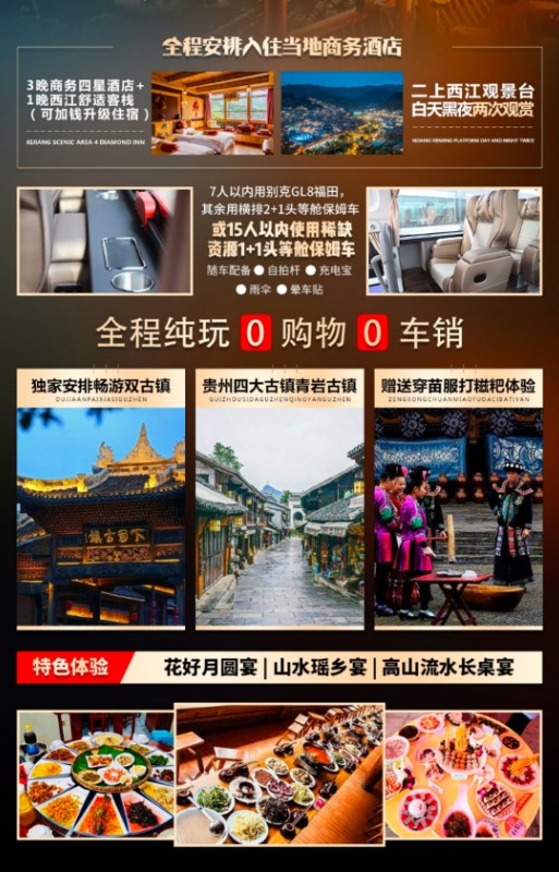 住宿可升级:2晚国际五星酒店+1晚网评五钻酒店+1晚西江网红客栈