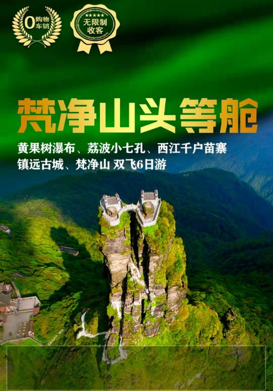 2、不含景区小交通:黄果树观光车50元/人+保险10元/人,小七孔观光车40元/人+保险10元/人,西江苗寨观光车20元/人+保险10元/人,镇远摆渡车20元/人,梵净山观光车20元/人,费用需自理。